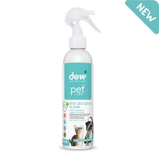 - 100% MINERAL: Dew First Aid Spray for Pets contains no organic substances, it is 100% Mineral based and formulated to be pH balanced. Extremely safe unlike other sprays on the market, Dew’s First Aid Spray for Pets antiseptic spray is non-toxic hypoallergenic and free from alcohol and enzymes. It’s also cruelty free, vegan and family friendly too.