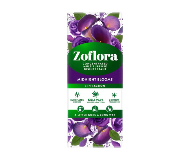 Zoflora Midnight Blooms 500ml is bursting with mystical and seductive notes, combining oriental roses and orange blossoms with rich, dark amber tones This alluring aroma will last up to 24 hours, helping you create a home fragrance that you'll enjoy for hours. Indulge in the luxurious and captivating scent of Zoflora Midnight Blooms. With a blend of oriental roses, orange blossoms, and rich dark amber tones, this 500ml bottle is sure to delight your senses for up to 24 hours (per cap full). Turn your home into a tranquil oasis with the long-lasting fragrance of Zoflora.