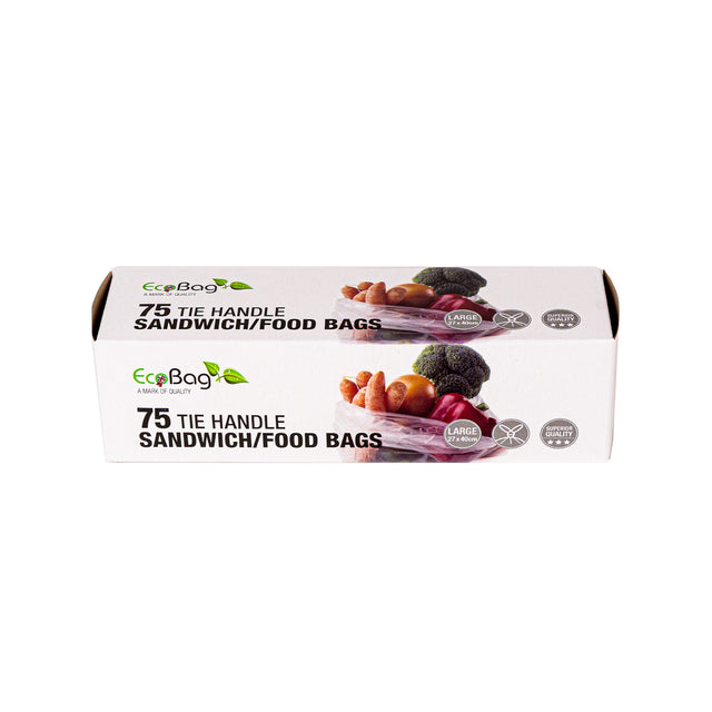 Our tie handle food bags are perfect for packing up sandwiches ready to go in your pack up for work or school. Easy tie makes these bags durable & easy to use. 100% recyclable. Constructed with convenience and sustainability in mind, our tie handle food bags are ideal for packing sandwiches for your busy work or school day. Each bag boasts an easy tie feature and is 100% recyclable.